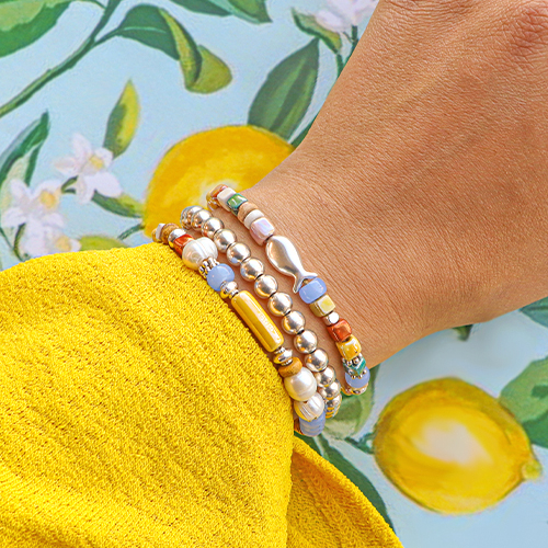 ¿Qué puede ser más divertido para tus clientes que una bonita colección de pulseras que todo el mundo pueda llevar? Diseña pulseras con abalorios de cerámica que alternas con, por ejemplo, perlas de agua dulce, cuentas Katsuki o un precioso abalorio metálico DQ. Cuando coloques un cierre, asegúrate de utilizar una cadena de extensión o de hacer un cierre con un nudo corredizo, por ejemplo, para poder ajustar la longitud de la pulsera.