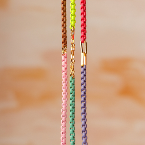 Esta serie de cadenas de colores es perfecta para diseñar pulseras y collares sencillos pero a la vez con ¡mucho estilo! Al trabajar con estas cadenas jasseron, recomendamos utilizar los cortadores laterales de Beadsmith para abrir la cadena y los cortadores planos con extremos de plástico para cerrarla. De esta forma no se dañará el revestimiento. Combina la cadena jasseron en colores con eslabones dorados y no te olvides de utilizar una bonita ¡cadena de extensión!