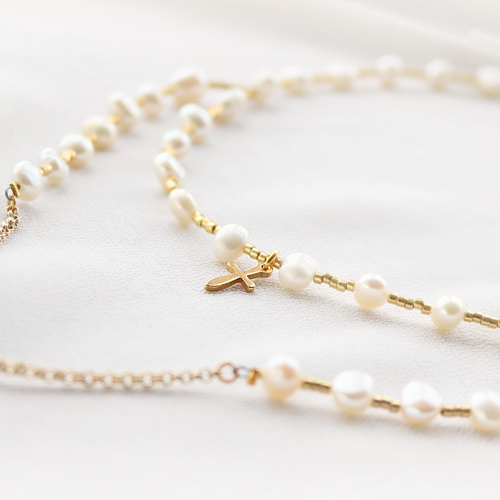 Esta vez hemos fusionado símbolos religiosos con las piezas de bisutería para crear una joyería religiosa de tendencia para ocasiones especiales como el bautismo, la primera comunión, la confirmación o el matrimonio. O simplemente para completar tu outfit con esta propuesta tan original. Para inspirarte, hemos diseñado un set de joyería con ayuda de colgantes metálicos DQ dorados y hermosas perlas de agua dulce para dar un efecto muy chic.También puedes utilizar estas fornituras para el diseño de collares estilo rosarios o pulseras con colgantes religiosos.