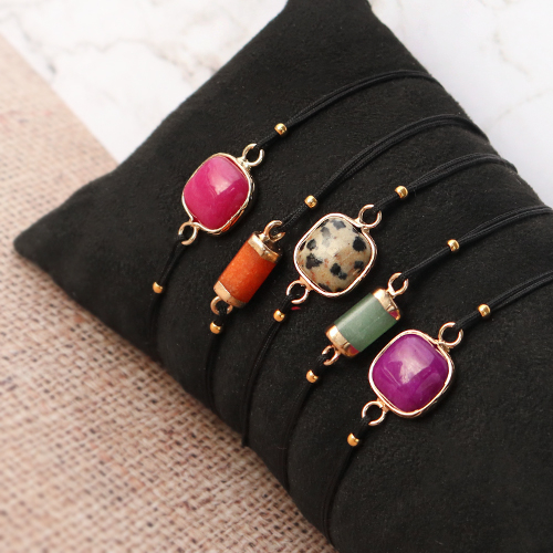 ¿Buscas inspiración para tu nueva colección? ¡Entonces echa un vistazo a estas ideas para hacer joyería con piedras naturales! Esta vez nos pusimos a prueba con las nuevas y maravillosas entrepiezas y colgantes de piedra natural. Con estos fantásticos artículos crearás joyas de tendencia. Por ejemplo, un lindo par de pendientes en ¡un santiamén!. Puedes hacer que el colgante de piedra natural brille uniéndolo a un componente base para pendiente. ¿Te gustan los pendientes más llamativos? Entonces combina una entrepieza de piedra natural con un colgante de piedra natural o un colgante de estilo bohemio. Sólo monta uno encima del otro. Usando colores brillantes, no sólo crearás un efecto uniforme, sino también único y especial. ¿Quieres crear pulseras a juego? Solo haz una pulsera con hilo macramé y coloca una entrepieza de piedra natural en el centro. ¡Suerte!