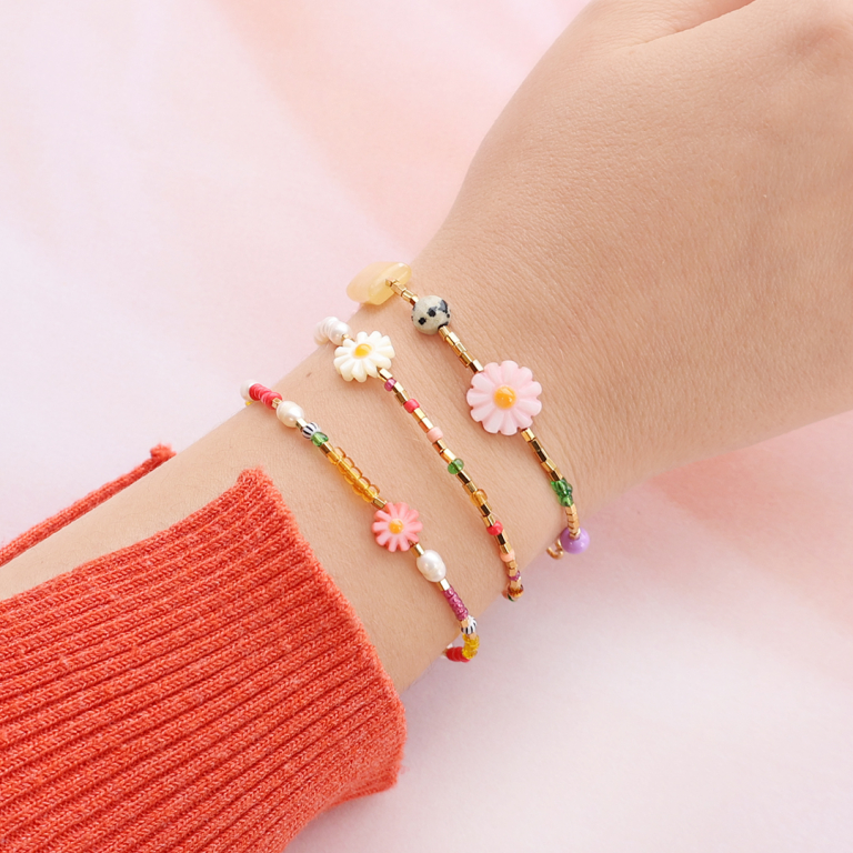 Crea un look veraniego con las cuentas de concha en forma de flor. Crea un bonito set compuesto por pulseras y pendientes. Enfila las cuentas en forma de flor en un bastón con bola en combinación con jasseron, una mezcla de abalorios y un ¡lindo pendiente criolla!