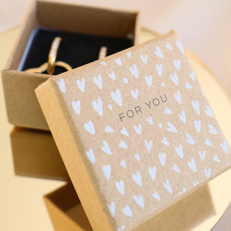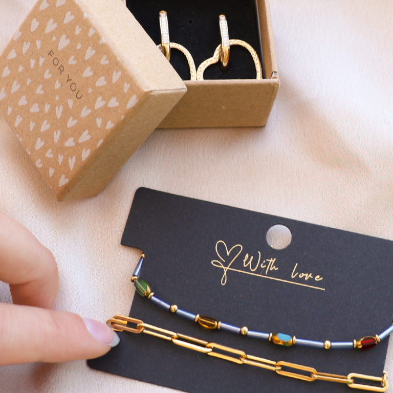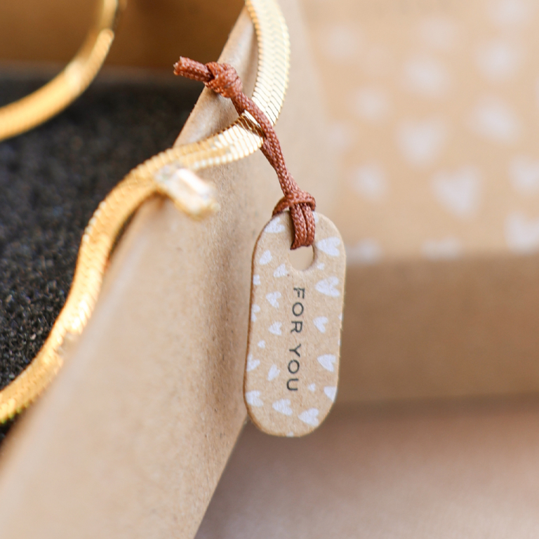¿A quién no le gustaría recibir una bonita joya en un estuche especial con una tarjeta personalizada? Las cajas y tarjetas han sido diseñadas por nuestro equipo interno de diseño con textos como ‘For you’ y ‘Pretty things inside’ ¡seguro que encantará a tus clientes!