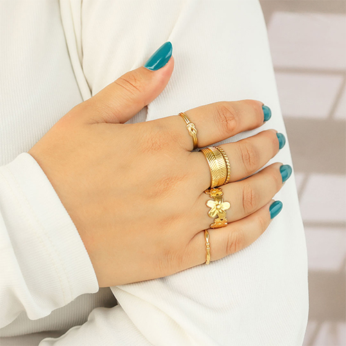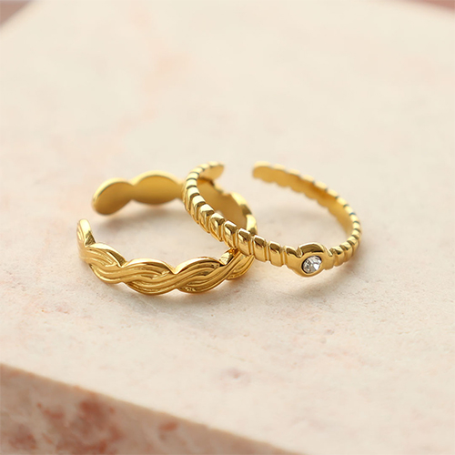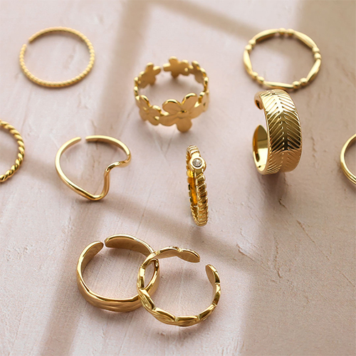 Esta práctica gama de anillos de acero inoxidable consta de anillos con diferentes diseños, como una flor y un corazón. Todos los anillos están disponibles en colores oro y plata y son de tamaño ajustable. ¡Una serie súper bonita para añadir a tu colección de joyería!