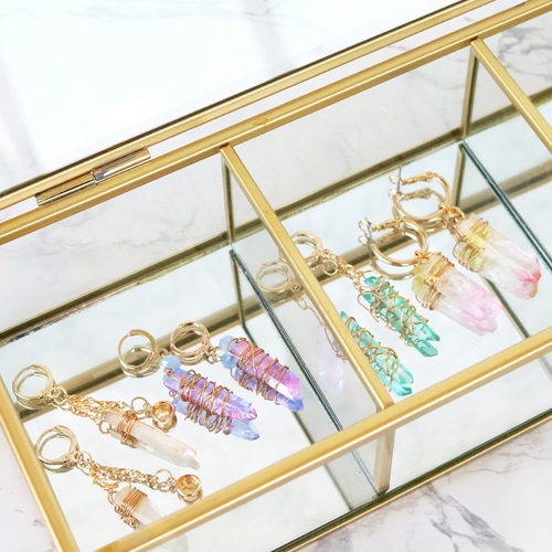 Ahora presentamos un concepto mucho más elegante con ayuda de la colección de cuarzos aura. Esta vez optamos por unos sofisticados pendientes para inspirarlos. Para esto hemos hecho uso de las fornituras metálicas. Como tip extra, sugerimos combinar los cuarzos aura con el alambre memoria, ya que este es súper funcional y se puede utilizar de mil maneras.