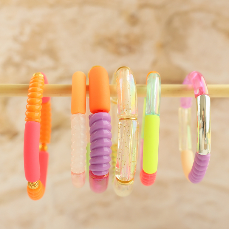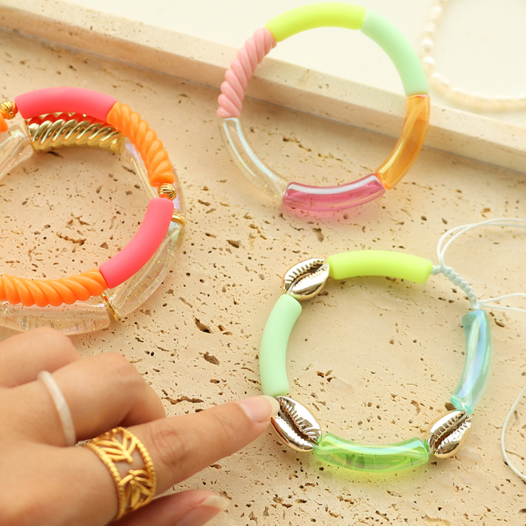 Esta nueva serie de abalorios acrílicos tubo mate veraniegos y con revestimiento AB es perfecta para crear pulseras coloridas. Enfila las pulseras con hilo elástico o de macramé y combínalas, por ejemplo, con conchas kauri para darles un ¡toque lindo veraniego!