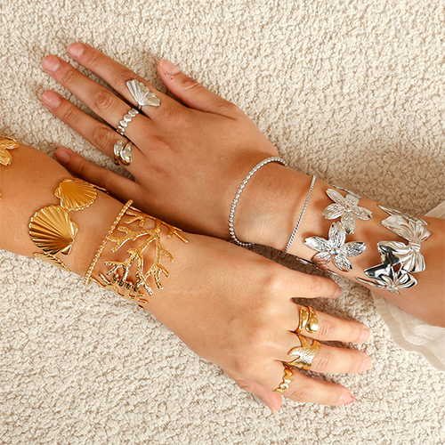 ¡Esta nueva colección de brazaletes y anillos de acero inoxidable es un verdadero imprescindible! Con diseños encantadores como conchas, flores y lazos, añade estilo a tu colección con facilidad. ¡Mezcla y combina para completar tu joyero!