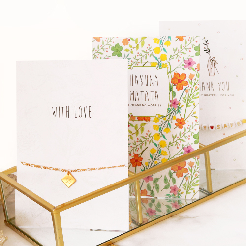 Con esta nueva serie de Tarjetas de joyería, tus clientes no solo podrán expresar sus más sinceros deseos sino también presentar una bonita pieza de joyería. Solo tienes que colgar el artículo favorito y acompañarla de un lindo mensaje. Siempre es agradable recibir un detalle como muestra de agradecimiento o simplemente para mostrar lo especial que es una persona para ti.