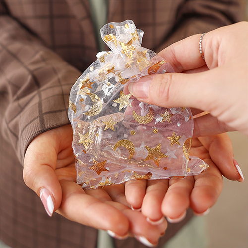 Estas prácticas bolsas de organza para joyas en colores invernales son imprescindibles en tu colección de otoño. Elige bolsos en diferentes colores con lunas, estrellas o flores para sorprender a tus clientes con joyas envueltas de forma festiva.