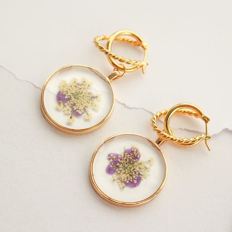 Preciosos colgantes y entrepiezas con flores secas para incorporar a tu próxima colección de joyería. Combina los colgantes y entrepiezas con cadena jasseron y perlas de agua dulce para crear las joyas de primavera más bonitas.